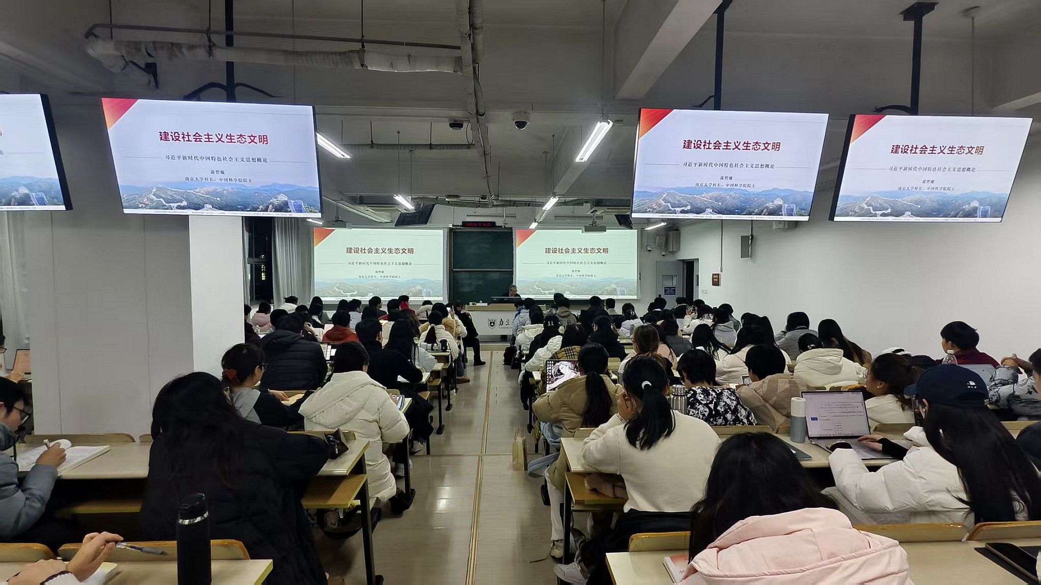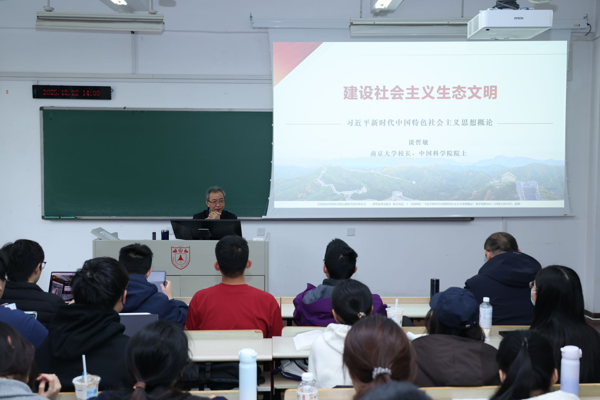 12月22日下午和12月25日晚间,大学校长、科学院院士谈哲敏走进“新时代特色社会主义思想概论”课堂,在仙林校区以“建设社会主义生态文明”为题,为来自哲学学院、商学院、海外教育学院等多个学院的2024级本科同学们讲授了内涵丰富、思想深刻的思政课。