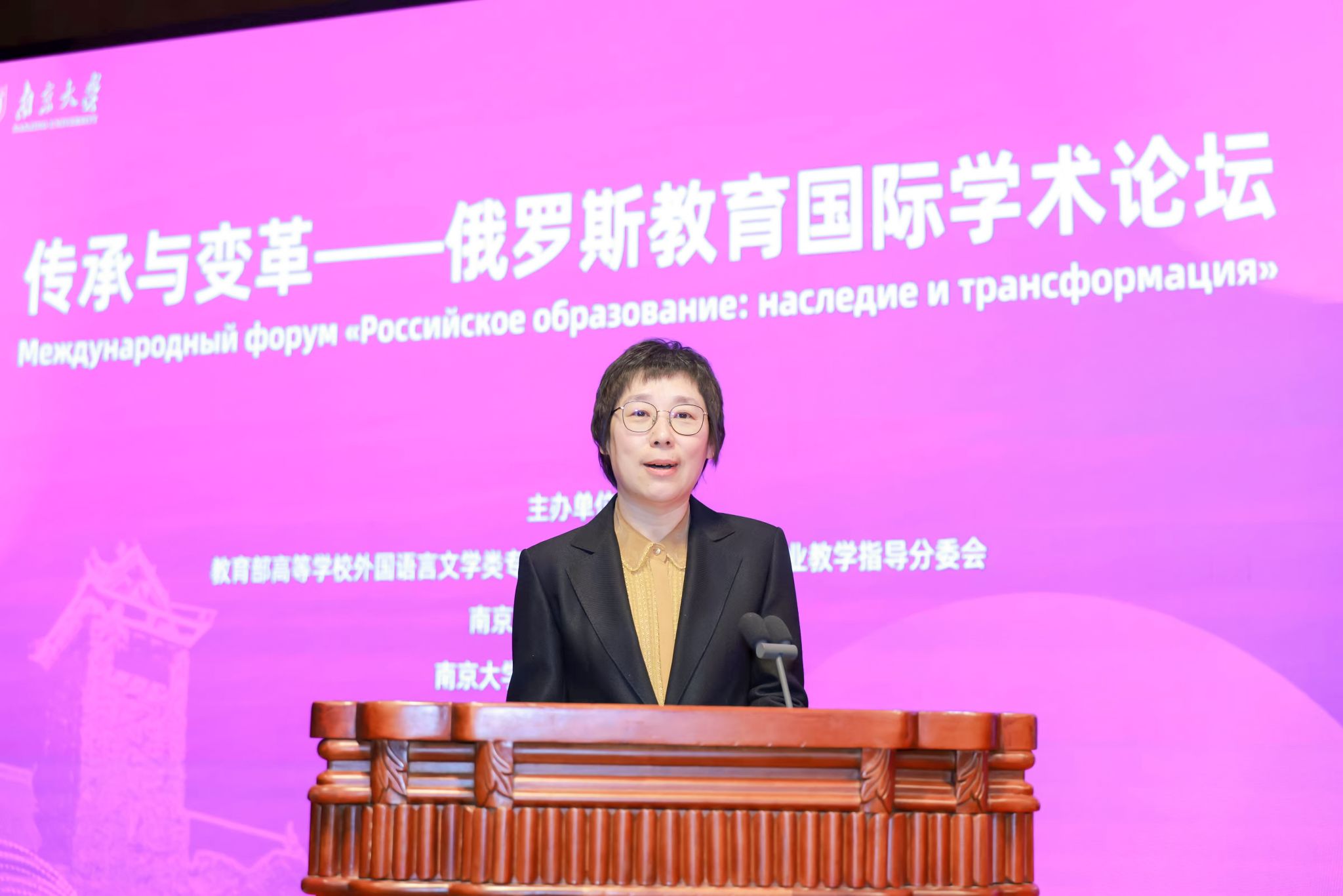 辽宁师范大学委书记、教育部高等学校外国语言文学类专业教学指导委员会副主任委员、俄语专业教学指导分委会主任委员刘宏教授致辞,她从服务国家战略、引领学科发展、创新合作模式三方面阐述了中俄教育合作的价值,并对俄罗斯教育研究提出框架性建议。